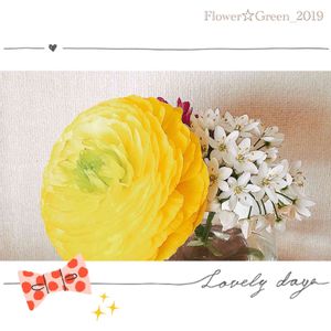 「イエロー&ホワイト」 🌈🌼🧚♀️ ☆ラナンキュラスと アリウム コワニー。 今も美しく咲いています😊 . ✿✿_(*˘︶˘*).。.:*♡ . 🌳💐🧸📱vol.4 [Flower☆Green_2019]