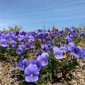 紫のパンジーの花言葉は「思慮深い」 爽やかな青空の下、それぞれ思い思いにお顔をこちらにむけてくれている可愛いパンジーと出会いました♡