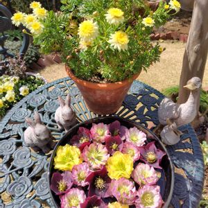 2025 第一回花手水😉 種類少なめですが、たくさん咲いているクリローさんたちを✂️しました😊 観客、私一人じゃなんだから、お庭のにぎやかしたちを動員😂 明日はお天気下り坂とか、、 今日は、チケットを戴いたので、プロバレーボール観てきま~す🏐