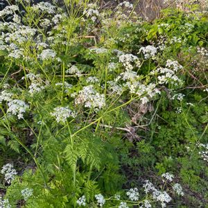 3/24に葉だけのpic投稿していて名前がわからなかったのですが、果実でシャクだと思うようになりました シャク セリ科シャク属 別名:コジャク、ヤマニンジン、ワイルドチャーピル 花期:5〜6月 全国の山野の湿り気のある草地に生える、0.7〜1.4㍍の多年草 葉は2回3出複葉で小葉は細かく切れ込む 茎は上部で分岐する 枝先に複数形花序を出し白色の花 総苞片はなく、小総苞片は卵形て数個つき下を向く、花弁は5個、外側2個が大きい シャクの種、熟すと細長く先が尖った黒い果実が古代神事に用いられていた赤(さく)米の米粒に似ることが名前の由来という説があるそうです 似ているらしいドクニンジンは花期が7〜9月で、果実はほぼ球形で、お花の花弁一枚だけが大きいそうです ↘️のお花はまた別の所に生えていましたが、お花見ると一枚だけ大きいようにもみえますね😅 茎葉柄に紫紅色の斑点はないのですが悩みます😧 また観察しなければ🤔
