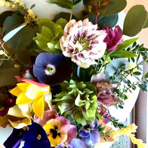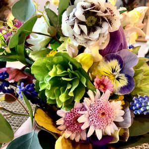 旦那さんが実家に行くと言うので、義母へ急いでお庭の花を束ねてみました。 なんか色に統一性がありませんが… クリスマスローズがあると豪華に見えますね😆 チューリップはまだ蕾で間に合わず…