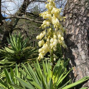 10月23日撮影 先ほど投稿したリュウゼツラン科ユッカ属の花。 キミガヨランかアツバキミガヨランか、わからなくなってしまいました。 左奥の葉がちょっと下向きになっているように見えるのですが、けっこうしっかりとした厚手の葉ですね…? キミガヨラン?アツバキミガヨラン? どちらなのでしょうか? ちゃんと下まで見てこなかったわたしの撮影の仕方が抜かっていたのですが…😅 教えてくださーい。