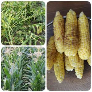 やはり台風🍃🌀☔で倒れた🌽とうもろこし😭 下は、花の時。 右側は収穫をしてみました😃