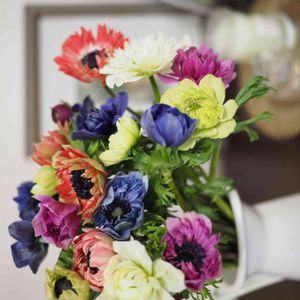 切り花のパンジー「絵になるスミレ」とアネモネポルト、ヒヤシンス、ニゲラ、雪柳を束ねたブーケ