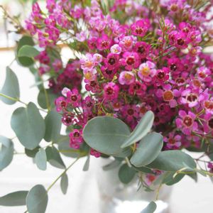 週末に産直で可愛いワックスフラワーを見つけてお持ち帰り。 ユーカリと一緒にテーブルに飾りました。