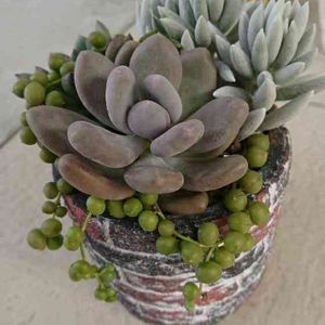 今日は晴れたり曇ったり🌤️であまり暑くないです。 天候はいいけど私が鼻炎で全然だ😖⤵️ セネシオ属、銀月(別名、ハオルチー)🌙 アーモンド型の葉っぱと真っ白で密に毛が生えた姿がとても好み💘 ふた鉢にゆとり植えしました。 奥の鉢はスペースがあいたので静夜っぽいチビエケと同居です👍✨ 真夏は半日陰管理が良さそうかも⛱️