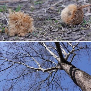 プラタナス プラタナスの大木にたくさんの実が付いています。枝先に点にしか見えないのですが。 周りには幾つか実が落ちていました。空で茶色に見えた実はオレンジ色に見えます。タネの塊のようにも見えタネを守る殻のような物は見当たりません。どちらも拡大するとよく見えます