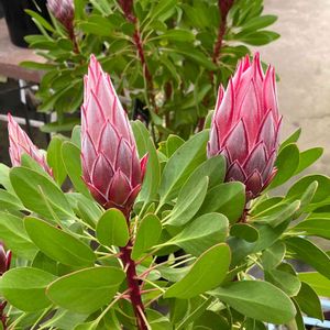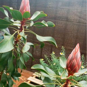 プロテア・リトルプリンス☆ 去年迎えたプロテア、今年もお花を付けてくれました。 鉢:プラスチック鉢10号 用土:ブルーベリーの土オンリー 肥料:春、秋にオージー用の肥料をパラパラと。 月1で硫黄粉末、エプソムソルトを株元に少々。 様子を見ながら鉄力あくあ500倍薄めたお水をあげたり。 酸度降下剤を混ぜたり、色々実験した子です。 真夏の西日ガンガンも、マンションの強風にも負けず。真冬の夜は室内に入れてました。雨にも濡れた事は無いのですが、下の葉っぱが少し痛みました。肥料焼けかも...? 梅雨と夏の蒸れる時期は、洋ランなどの支柱で鉢の角などをサクサク刺して空気を入れてました。秋にルーツポーチに植え替えたいです笑 #プロテア #プロテアリトルプリンス #オージープランツ #ネイティブフラワー