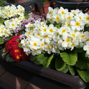 こんにちは☁️ 雨が降り出しそうで、この二鉢が庭を明るくしてくれています。 昨年末に迎えたガーデンプリムラアラカルトシュシュの寄せ植えです。 ⬅️バコパが咲き揃い枝垂れていい感じになりました。 ➡️零れ種の赤いアリッサムと白い金魚草と寄せ植えしてみましたが、咲く頃にはプリムラが枯れてしまうかも。 プリムラが枯れないうちに記念写真ね😃