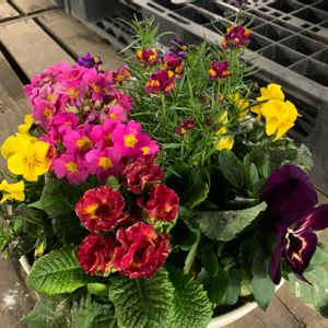 こちらもかなり色んな色が入っている、普段はあまり作らないタイプの寄せ植えです😀 赤系とその後ろの紫系のリナリアを選んで、それに合わせて、赤に金色のふちどりのプリムラを前方に🌸背が高くなるものを‥と探したら、このピンクのガーデンプリムラが目に止まりました🌸花芯の色と同じ黄色のビオラを合わせました。