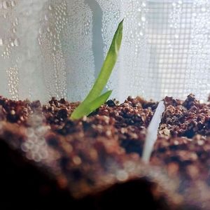 ハオルチア ♀日月潭✕♂大型オブツーサ 種を蒔いて3ヶ月、ようやく2本目の葉が伸びてきました。 100均で買った、スクリュー蓋つきのプラスチック容器に、レンチンで煮沸消毒したバーミキュライトのみの用土で、保湿・密閉状態で育てています。 交配してふたつだけできた種のうち、このひとつしか発芽しなかったので、大きな株になるまで、しっかり育てたいところです。