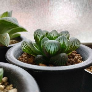ハオルチア ♀日月潭✕♂大型オブツーサ 交配して種から育てています。 交配時、開花の時期がずれたのもあって、種は2粒しか採れず。しかも発芽したのはこのひとつのみ。 種をまいてから5ヶ月近く、なんとかここまで育ったので、発芽用のタッパーから鉢にあげてみました。 大型種同士の交配なので、プリプリの大きな窓が空いてくれたらいいなと、ちょっと期待。