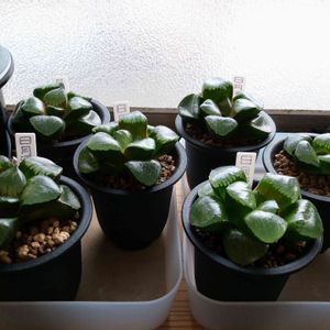 ハオルチア 日月潭。 好きな品種で5鉢も集めてしまいました。 窓辺の小スペースなのに! あ〜あ。 ちなみに右端の鉢はスプリング交配種で、日月潭ではありません。 あしからず。