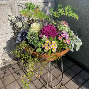葉ボタンのリングバスケットに 小さな寄植えを重ねたら お正月らしいゴージャスな感じになりました 皆様来年もよろしくお願いいたします