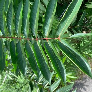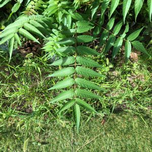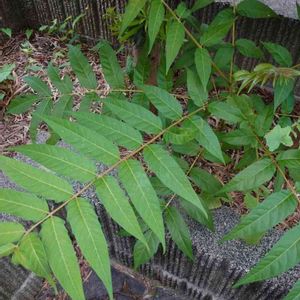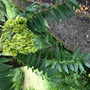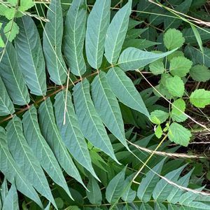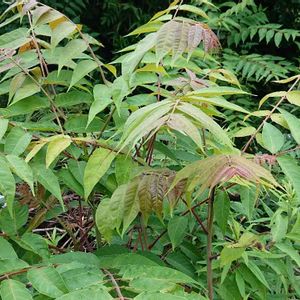 ニワウルシ(シンジュ) ニガキ科ニワウルシ属 中国原産 庭木やカイコ用に入って来たが今では日本全国の河原等にはえる(帰化) ウルシと付いているが毒は無い。 葉は羽状複葉(奇数又は偶数)頂小葉は著しく小さい、葉片基部にはっきりした鋸歯が数個有る。picは♀株 秋に熟した翼果は風に乗って飛んで行く。