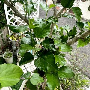 コーラルホワイト ホワイトバタフライともいう。 ハイビスカスです♪ 冬は 大丈夫?って思う程枝も見た目もか弱そうに見えるのに今年は 何がどう上手くいったのか?…高〜く伸び葉も繁り先週の金曜日に5輪咲きで迎えてくれました✨😳〜感動〜♪それからは1輪ずつですが咲いてくれています♪ 暫く楽しめるかな✨