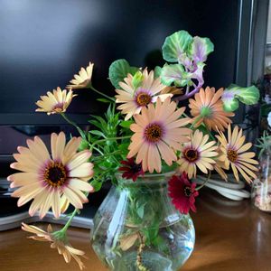 おはようございます😃 離れで育てていたオスペルマムと花ともさんからいただいたタネから育てた葉牡丹。 離れで朝のみわたしがみてるだけでは可哀想なので母家に持ってきました💕