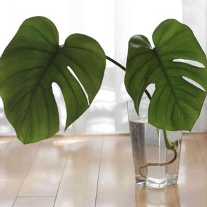 葉っぱが、なかなか割れなかったモンステラはこんなに大きな葉っぱになりました。 2枚を切って、水で育てています。 気根て、水の中でも伸びるんですね。パワーを感じる葉っぱです。