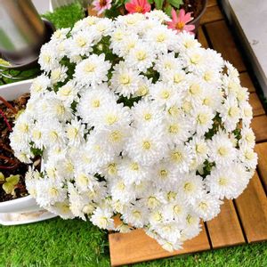 ガーデンマム ミスティック ホワイト! 10月上旬またまた立寄ったホームセンターで前から欲しいと思っていた花が窮屈そうにしていたので購入しました。 3.5号ポット→6号プラ鉢に植替え一ヶ月、満開です😀 越冬後は大きな株になるよう励みます😀