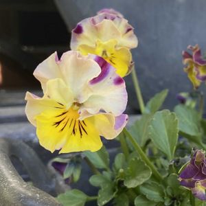 ビオラ ステファニー レモン色のグラデーションにちょっと入るパープルがアクセントのビオラを見つけました💛💜 プレートを見るとステファニー! 今までも数株育てましたが、この子は茎が長いタイプのようです 微妙に色合いが違ってとても可愛らしいビオラです 2枚めのワインカラーのお花♥️も この株のお花です♡♡
