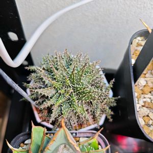アロエ ハイブリッド、デンティティ、 ハオルチア アトロフスカとピグマエアの ミュータント、ほかハオルチアたち。 こちらのhybはトゲが大きく地肌が濃い目。 デンティティは花芽が伸びてきました。