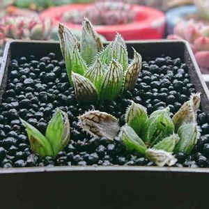 Haworthia hyb. snowqueen 細雪とサファイアの交配種。 最終形態がなかなか渋綺麗。 新しい交配種ではないのですがあまり見かけません。 まだ上下共に若いです。 上の株も去年はまだ下の株位でした。 別途に葉挿しからも成長中。 私好みの磨りガラスな窓に明瞭な葉脈が入る美種です。
