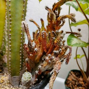久しぶりに登場の ポコポコサボテンです 持ち運びの時にめっちゃグラグラ揺れるのでテキトーな補強つけました(笑) 長さ測ったら 52㎝でした🎶 3ポコくらい増えたきがします(笑) 下の方は綴化ですが 広がって伸びてきてます🎶 その調子👍