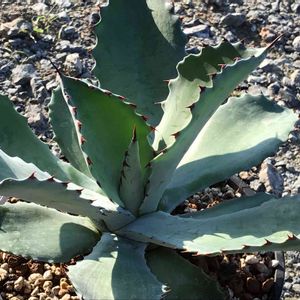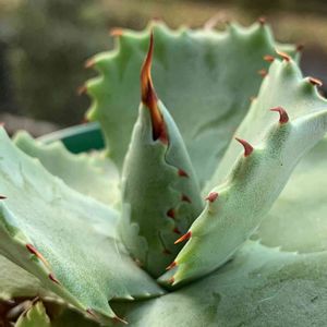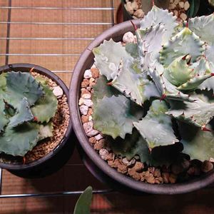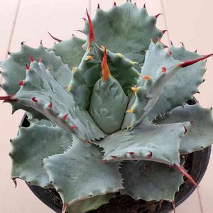 アガベ 王妃カブトガニ ぷっくりギザギザの葉先に小さい赤い棘が可愛い王妃カブトガニ。 カキ仔が7つと子沢山タイプの様です。 どんどん増えそうでちょっと心配です。🤔