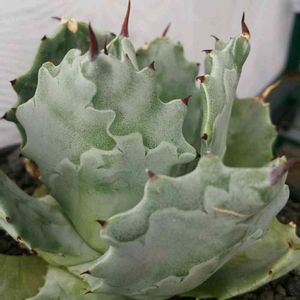 令和になってもオヤジは多肉狩り(¯∇¯٥) ② ●番号は実店舗で物を目にして手にとってのお迎え。 ○番号は \_ヘ(Д`*) カタカタ… (*´∀`)σ凸ポチッ 実際は平成ラストの落札でしたが届いたのが令和になってからですのでこちらにカウント Agave isthmensis "Kabutogani"marginata アガベ イシスメンシス ‘カブトガニ’ マルギナータ 和名:アガベ 兜蟹 斑入り お迎え:2019/ 5/ 3 撮影 :2019/ 5/ 3 発根促すために水苔巻いてます。2.5号鉢 室内撮影でちょっと色味が変わっちゃってます😅 カブトガニと言ったら【連棘】でしょ🤔 この大きさでもこの連棘。 探していた特徴が良く出ている個体に出会えました \(。˃ ᵕ ˂ )/ ✧*。 ♪⁽٩( ᐖ )۶⁾⁾ ₍٩( ᐛ )۶₎♪ ‹‹\( ˙▿˙ )/››‹‹\( ˙)/›› ‹‹\( ˙▿˙)/›› 「大きくなったら連棘出るよ」 なんてヘタレな私に出せるわけないじゃん <(๑¯﹀¯๑)> エッヘン!!?ナゼエバル この後、連棘維持できるかは育て方次第……だ、そうです (´・ω・`;)ハァー・・・ 極端な話、連棘であれば斑が入ろうが入らまいがどちらでも良かったので斑は不鮮明です( ¯―¯٥) 注)ポタトルム ベルシャフェルティ(怒雷神)の連棘を兜蟹とすることもありますが、 そもそもポタトルムとイシスメンシスの関係もはっきりしてないようなので、 私見として連棘が著しい物を兜蟹としています。というより考えないようにしてます ('ロ'('ロ'('ロ'('ロ' )!!!