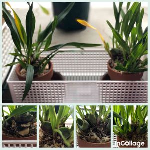 オンシジウム ケイロホルム 昨年12月購入→4月植え替え 植え替え時、鉢底の穴からそっと押し出すと小さな株が2つ寄せ植えされていた 左)葉は大きめ、バルブ数少なめ 冬の間に黄変したバルブはそのままにして植え替え →枯れて乾いて来た 右)葉は小さめでよく茂る、バルブ数多め 黄変したバルブは取り除いて植え替え この後どう成長するのかな? 新葉の根元がバルブ化する?