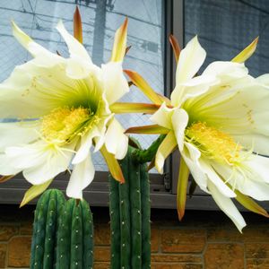こんにちは~凄い☔です😲 ~ヤマカル柱~です🌵 昨日の昼前、咲いてました✨ 午後☔だったので、 夕方は💠が潰れかかってました😒 📱出来てよかったです🎵 ☀️だったら満開だったでしょう😂