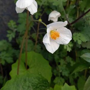 シラユキゲシ(白雪芥子) ケシ科 別名:スノーポピー 🌱神戸市中央区に鎮座する「小野八幡神社」の鉢植えに咲いてました🤗 🌱可憐、淑やかでいいね👍️ 🌱この神社には、珍しいお花が咲いてるから、時々寄ります😃 🌱🌱🌱 半日日陰の湿った場所を好む あまり日当たりがよくない場所でも、きちんと花を咲かせてくれる 地植えするなら、落葉樹の下🤗 🌱🌱🌱🌱 うちの桜の下ならいいかも❓️ 地下茎がどんどん伸びて広がって行くので、放っておいても増えるって😢 これはちょっと困るね😅 やっぱり、鉢植えがいいね😅