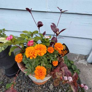 秋になって作った寄植え マリーゴールドとアルテルナンテラ・レッドフラッシュとニチニチソウとこぼれ種で生えてきたヒメツルソバ マリーゴールドが元気です(*^^*)