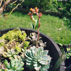 梅雨入り前の頃の エケベリア キロフ この頃は綺麗だったよね🥰 綺麗な形を維持するなら花は咲かせなければよかった。まあ勉強勉強😅