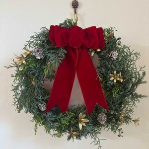 コデマリの古枝整理で出た枝で シンプルなクリスマスリースでも作ってみるか!と 手作りリース初挑戦〜🌿🔔🎀 …リボンテープにだいぶ助けられました😅