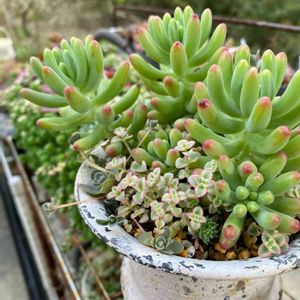 ルノーさんは気難しいと思っているので 他の子よりも気を遣う🤗 なので置き場所を分けていて 根元にぐるっと赤ちゃんが付いている2苗は VIPルーム(ビニールハウス)で管理 小さな鉢の子は1年中外で管理‼️ どちらも元気に春を迎えることが出来た💕 そして小さな鉢の子にも根元に小さな小さな赤ちゃんが誕生していた💖 1年以上育てる事が出来て ルノーさんを育てる自信がちょっと持てるようになって来たかな❣️ なんて言っていると… 急変… しないでね🍀