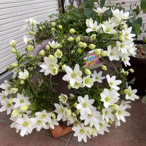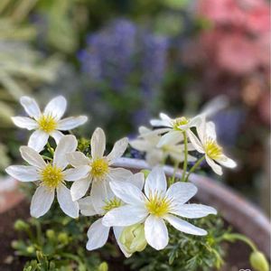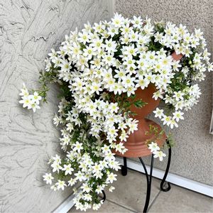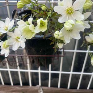 2年目の常緑クレマチス カートマニージョー 昨年まつおえんげいさんで20センチくらいのかわいい子をお迎えして1年後の今シーズン長さが1メートルになってしまい、慌てて4号鉢から4号ロングに微妙に鉢を大きくしました😅 1年で20から30センチ伸びるらしいので、計算合わないの(՞. ̫ .՞) 肥料、あげてないし、なんもしてないんやけど。 今年、強剪定するぞ〜!(´▽`)