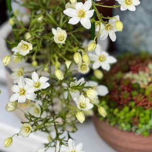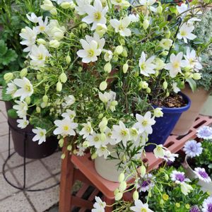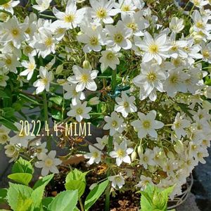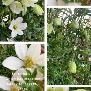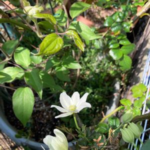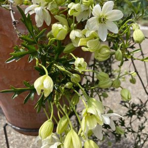 常緑クレマチス ◻︎カートマニージョー 2年目の鉢植え🪴 あいにくの雨模様が続いていますが、 開花が始まりました👏✨ すごい花数になりそうな予感...💕