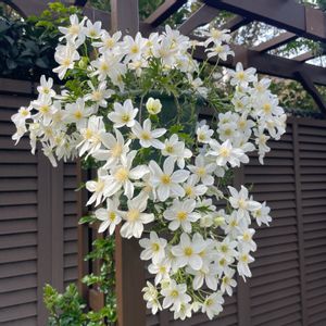 つるバラ用のパーゴラに吊るしたクレマチスカートマニージョーが満開になりました! 常緑とのことなので、このまま吊るしておこうかと思ってます。😊😊