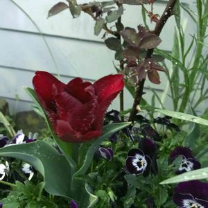 去年は咲かなかった深紅のチューリップ 今年はお目見えです💕 まわりのビオラはタネから育てた物ですが だんだん原種の三色スミレに戻っていく😓 だから庭に紫が多くなる😢