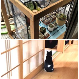 ここ最近、調子が悪い 子猫の爪🙀 爪が赤いのは 良いんだけど、葉まで 赤くなってきて、なかには、萎れてきたものも💧 温室で様子をみてみよう😓 おはぎは すかさず 子猫の爪をチェック👆 その後、娘の部屋で かまってと、ゲーム🎮の邪魔😅してます💦