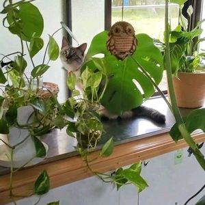 🏷フクロウ祭🦉 ポトス モンステラ スパティフィラム と シロ。😸 みんな仲良くスクスク育ってます (*^3^)/~♡