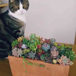 昨日完成して、投稿した多肉寄せ植えを眺めるマロン🐱 気に入ってくれた?