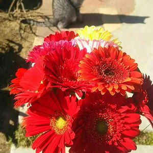 ガーベラで あこがれの ブーケ きれいにラウンドするのは むずかしい~💦 撮影場所に 悩み ウロウロ 我 関せず の にゃんこ 吾が輩は 猫で ある ・・・そうだね