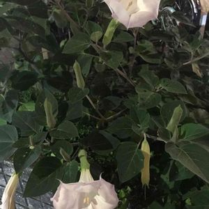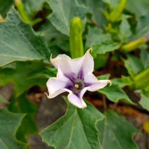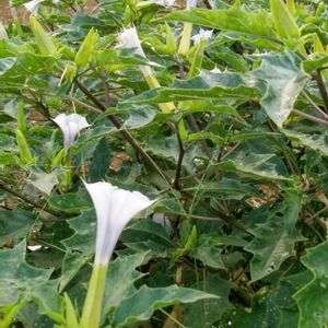 シロバナヨウシュチョウセンアサガオ 白花洋種朝鮮朝顔 五分咲きの印象。 これで満開。 開くのは、朝で無く、 夕方から。 毒にも薬にもなる。