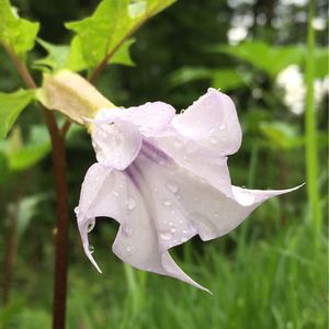 洋種朝鮮朝顔。まだ実がなっていないので、いまは同定できないが、暫定的にこの名にした。近縁種に、トゲナシ(棘無)洋種朝鮮朝顔があり、どちらかである。同定のポイントは、球形果実にトゲがあるかないかで見分ける。実がなる秋にはっきりさせることにしよう。(20日後、確認したら、果実に長いトゲがあった。ヨウシュチョウセンアサガオで同定。) ナス科チョウセンアサガオ属。熱帯アメリカ原産で、朝鮮渡来ではなく、外来種ということで付けたようだ。もともとこの花は温暖な地域に野生化しているが、標高約900mの山野を整地したところで、かなりの数がまばらに生えているのを見つけた。 第一印象はちょっと異様な光景がした。葉は不規則で大きな鋸歯状のとがりがある。茎は暗紫色を帯びている。花は漏斗状で、先が五裂し白っぽく、基部は淡い紫色。夕方咲いて、翌日しぼむ。たまたま今朝、小雨が降っていた時間なので、夕方と間違えて咲いたのだろう。 江戸時代、華岡青洲がチョウセンアサガオを主として麻酔薬をつくったとあり、役に立つ毒草ではあるようだ。どこか不気味な感じは、やはり殺気があるからかもしれない。