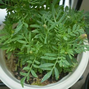 相談です😢(元気の無い子達) マリーゴールドちゃん。 株分けしたのですが、片方は枯れてしまい、こっちの子は鼻が咲かずにまた葉に斑点が…蕾は出来ているのですが🥺