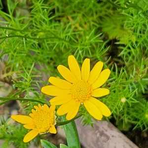 『ダーグベルグデージー』 カラクサシュンギクとも言うそうな… 【花言葉】 可愛い恋人💕 お庭のプランターの中に いつもチリチリした葉で 蕾なのやら なかなか花弁が出てこない…これは何なんだろう🤔と ずっと思っていたら…今日から黄色い可愛い~いお花が咲きました😊👍💕 植えた覚えがないのに...🤔 でも 嬉しいな😊😍💓
