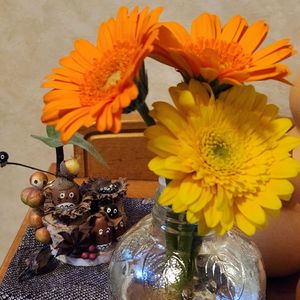 『ガーベラ』 近所のおばぁちゃんが 雨の中届けてくれました😱💕 私が脊柱ヘルニアと 脊柱管狭窄症で悩んでいるのを知ってか… 自分がお花の苗を買いに行ったついでと言っていたけれど… 嬉しかった😌☺️涙💧出る程に... 可愛い木の実のオブジェは仲良しの先輩から頂きました☺️✨️ 瓢箪は 昨年自分が種から作りました😅💦 まだ瓢箪ランプまで至りません🙂↕️ 後に【花言葉】調べてみたら… *希望 前向き 冒険心 でした😣😭😆👍🎉🎉🎉