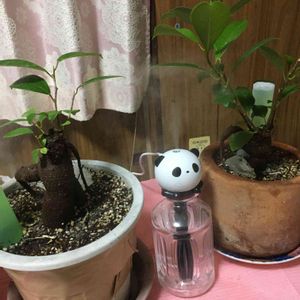 パンダが頑張る姿 めっちゃガジュマル2号の葉っぱ当たってる!笑1号さん左にチラリとクジラも頑張ってます そして白い奴は茶色くなった… 立派な茶色に育ちました